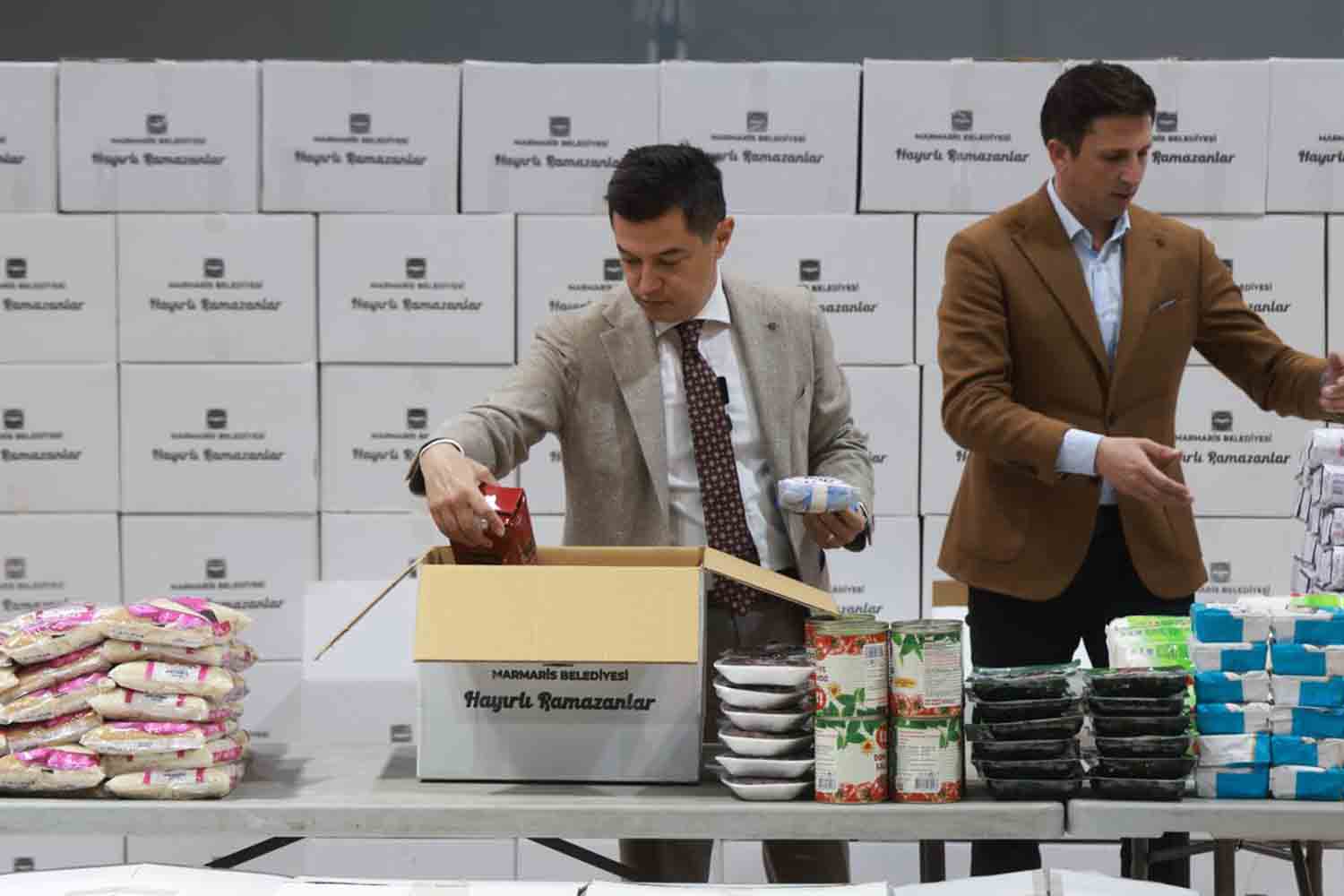 Marmaris Belediyesi’nin hazırladığı Ramazan erzak kolilerinin paketleme sürecine katılan Belediye Başkanı Acar Ünlü, R...